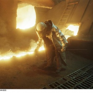 Arbeiter am Hochofen bei der Stahlerzeugung durch Roboter ersetzen