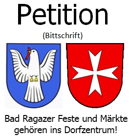 Seit mehreren Jahren werden wir Einwohnerinnen und Einwohner, Bürgerinnen und Bürger, Kinder und Freunde von Bad Ragaz aus dem Dorfzentrum verbannt. Wir müssen unsere Feste und Veranstaltungen an der Bahnhofstrasse abhalten. Dieses „Abschieben“ ist nicht korrekt. Wir sind hier zuhause! Überall findet das Dorfleben und die Festivitäten im Zentrum statt. Das wollen wir auch. Wir bitten den Gemeinderat und den Ortsverwaltungsrat darum, uns wieder ins Dorfzentrum zu lassen! 7310 Bad Ragaz, Herbst 2011