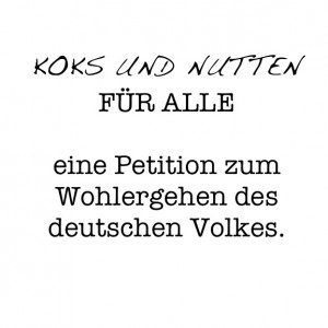 Wir machen mehr aus den Steuermillionen! Koks und Nutten für Alle! 'Koks und Nutten für Alle' ist eine Petition, die im Petitionsausschuss des deutschen Bundestages verlesen werden soll und ein Gleichgewicht zu Gunsten des kleinen Mannes und seiner Benachteiligung in der Drogen- und Prostituiertenbeschaffung/-bezahlung, herstellen soll. Was wir fordern sind: Alljährliche vom Staat subventionierte Partys mit Kokain und Prostituierten zum Flatratetarif. Wir zeigen, wie man 60 Millionen EUR besser investieren kann, als in den ganzen Kunst und Archtiketurrotz, eAkten, die keine eAkten werden oder ganz nach dem Vorbild großer Versicherungsunternehmen. Führende Politiker, Manager, Bankiers oder Bankersöhne machen es vor. Mit Kokain und Prostituierten können wir 'ne Menge Spaß haben. Freut euch auf die erste Koks und Nutten Party in eurer Stadt und gebt eure Stimme für 'Koks und Nutten für Alle'!!!