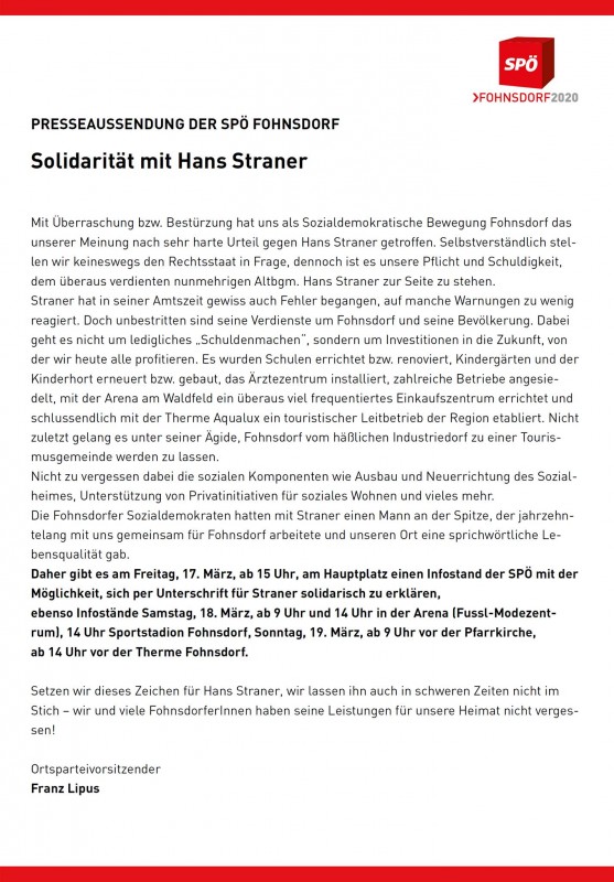 Mit Überraschung bzw. Bestürzung hat uns als Sozialdemokratische Bewegung Fohnsdorf das unserer Meinung nach sehr harte Urteil gegen Hans Straner getroffen. Selbstverständlich stellen wir keineswegs den Rechtsstaat in Frage, dennoch ist es unsere Pflicht und Schuldigkeit, dem überaus verdienten nunmehrigen Altbgm. Hans Straner zur Seite zu stehen.