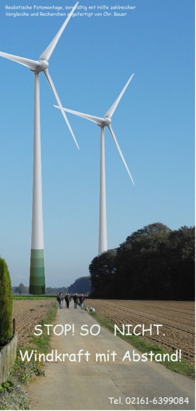 Die NEW plant am Buchholzer- und Hardter Wald insgesamt 4 Windkraftanlagen zu errichten. Nach diesen Plänen sollen 150 m hohe Windkraftanlagen unsere durch Lärm unvorbelasteten und unter Landschaftsschutz stehenden Naherholungsgebiete belasten. Die Windkraftanlagen sollen mit einem Abstand von nur 500 Meter zur Wohnbebauung aufgestellt werden, das sind mindestens 1000 m zu wenig. Wir die Unterzeichner, fordern die zuständigen Entscheidungsträger unserer Stadt auf, rasch die notwendigen Schritte gegen die geplanten Windkraftanlagen am Buchholzer – und Hardter Wald zu unternehmen. Wir sprechen uns mit unserer Unterschrift gegen die geplanten Windräder an den vorgenannten Standorten aus. Es kann nicht Sinn einer vernünftigen Stadtentwicklung sein, nun auch die letzten für die Bevölkerung verbleibenden Ruhezonen mit Lärm zu füllen.