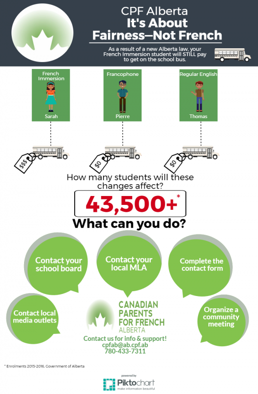 Albertans value choice in education and want programming offered by the school boards to be accessible to every student. Transportation fees should be fair and equitable for all families. We request that the Minister of Education and his staff, consult with all parents and other education stakeholders to review the legislation now being implemented in Bill 1.