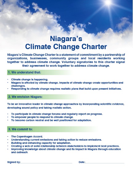 Niagara's Climate Change Charter is a statement of commitment by a partnership of organizations, businesses, community groups and local residents working together to address climate change. Voluntary signatories to this charter signal their agreement to work together to address climate change.