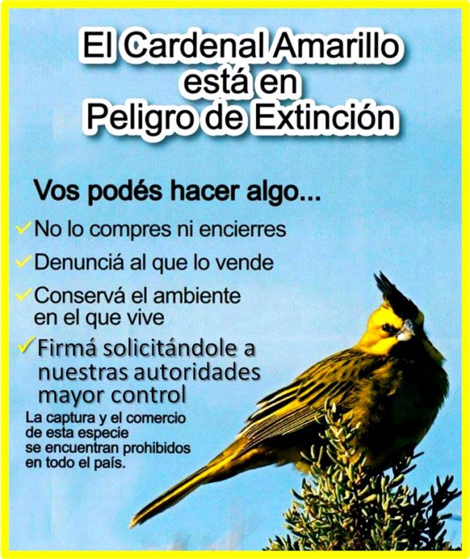 Ayudanos con tu firma para solicitarles a las autoridades provinciales la ejecución de las medidas necesarias para reducir o eliminar la captura indiscriminada y el tráfico ilegal del Cardenal Amarillo y demás aves nativas.