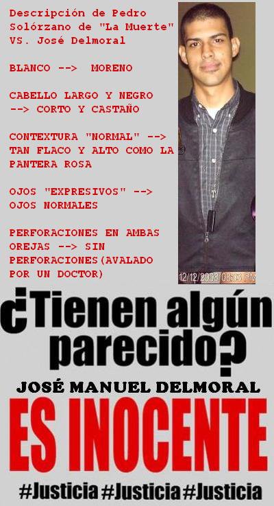 José Delmoral es un jóven Venezolano que injustamente está privado de libertad desde el 24 de Noviembre de 2009 por un crimen no cometido. Todas las pruebas necesarias para demostrar su inocencia están a la mano para cualquier persona que amerite comprobar la misma, especialmente el Juez, abogados, fiscales y demás consultores que lo requieran, este es un pedido formal que se hace para devolverle la libertad lo más pronto posible a una persona a la que le han robado casi tres años de su vida, es hora que la Justicia Venezolana se haga sentir y con esta humilde petición se hace presión para que su libertad le sea devuelta!