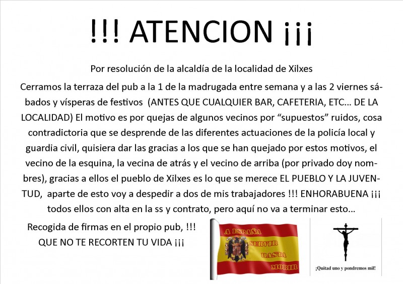 Los abajo firmantes solicitamos al ayuntamiento de Xilxes la continuidad del horario establecido por norma al pub Koral's sito en calle lepanto 2A bajo 3 de Xilxes para el cumplimientode la licencia vigente y de que dispone, de lunes a jueves de 12 a 3 y viernes, sabados y visperas de festivos de 12 a 4:00, asi mismo manifestamos que durante nuestra estancia en el interior del local como en la terraza anexa al mismo, nunca hemos observado altercados, y/o ruidos que puedan molestar la convivencia pacífica de los vecinos durante el horario establecido.