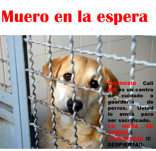 Exigimos que la Alcaldía de Cali tome las medidas necesarias con respecto a la actual situación por la que pasan todos los animales que llegan a Zoonosis y los que están en las calles. Es necesario que se ponga en manos de entidades de protección animal la gestión de la recogida y albergue de animales abandonados, para que a través de programas de adopción, campañas de esterilización, proyectos de educación y sensibilización den un servicio humano como ellos se merecen. Por qué la solución de este problema no es la muerte de indefensos animales sino la esterilización y la concientización de la GENTE.