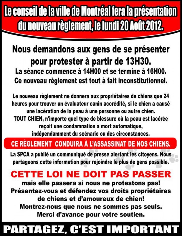 De plus, le nouveau règlement qui sera mis de l’avant sous peu par la Ville est encore plus problématique, puisqu’il prévoit l’euthanasie obligatoire et automatique de tout chien ayant causé une lacération de la peau, peu importe le contexte ou la gravité de la blessure. Si un chien égratigne superficiellement un autre chien en jouant dans un parc à chien ou s’il mord quelqu’un en essayant de se défendre, la Ville serait tenue de condamner ce chien à mort. Ce nouveau règlement pourrait donc causer la mort de centaines et même de milliers de chiens, dont bon nombre ne posent aucun danger réel. Par ailleurs, les propriétaires de chiens qui souhaitent contester l’ordre d’euthanasie ne disposeraient que de 24 heures pour obtenir une évaluation comportementale de leur animal. Ce délai est insuffisant puisque le temps d’attente pour consulter un tel spécialiste à Montréal est typiquement d’au moins une semaine.