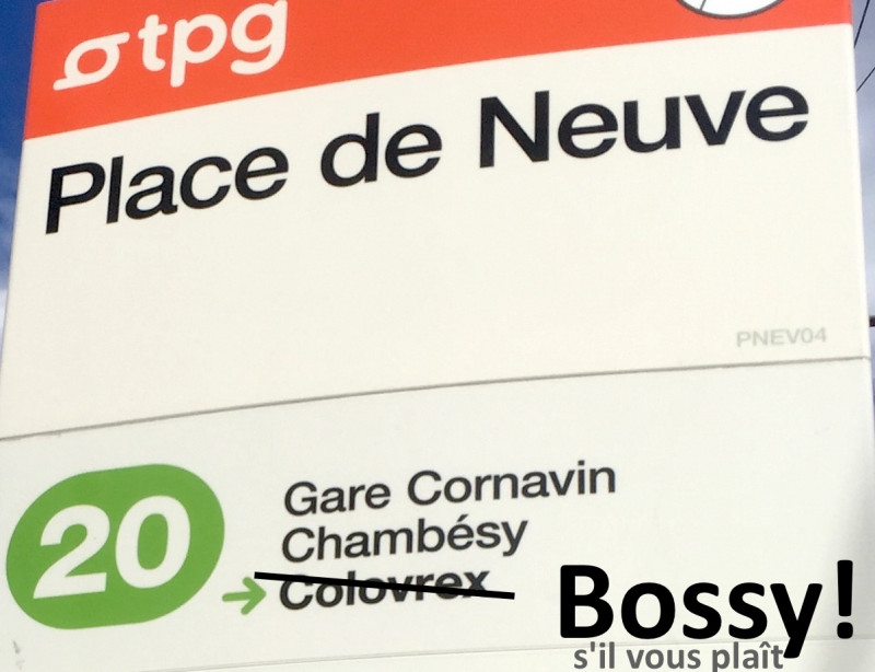 • efficacité: connexion directe avec le centre-ville (Bel-Air, Place de Neuve), le collège d’attribution de notre commune (Sismondi), les quartiers des organisations internationales, Nations, Cornavin — c.-à-d., avec toutes les destinations principales des habitants; • confort: sans correspondances, en toute tranquillité sans natel, avec une vraie qualité de vie en voyageant; • sécurité: inutile d’attendre, parfois très longtemps, à Colovrex qui est un endroit désert et potentiellement dangereux; • fluidité et assurance d’arriver à temps.Je prie les TPG d’inclure l’extension du bus 20 jusqu’à Bossy dans la prochaine rédaction de l’horaire.