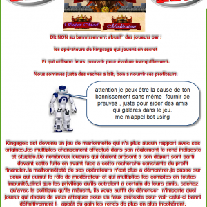dit non au bannissement abusif des par : les opérateurs de kingsage qui jouent en secret, et qui utilisent leurs pouvoir pour évoluer tranquillement. nous sommes juste des vaches a lait , bon a nourrir ces profiteurs. kingsage est devenu un jeu de marionnette qui n'a plus aucun rapport avec ses origines, les multiples changements effectués dans son règlement le rend indigeste et stupide . de nombreux joueurs qui étaient présent a départ son parti devant cette fuite en avant face a cette recherche constante du profit financier , la malhonnêteté de ses opérateurs qui multiplies les comptes en toute impunité , ainsi que les privilèges qu ils octroient a certains de leurs amis. sachez qu avec la politique qu ils mènent , ils vous suffit de dénoncer n'importe quel joueur qui risque de vous attaquer sous un faux prétexte pour voir celui-ci banni définitivement. l appât du gain les rends de plus en plus incohérent.