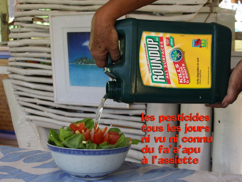 Les pesticides les plus nocifs et les plus utilisés en Polynésie française sont les herbicides contenant du glyphosate (Round up), du paraquat (gramoxone) et du 2,4-D.Ils représentent 48% des importations de pesticides destinés à l’agriculture ou à l’usage domestique, sont en vente libre dans les commerces et se retrouvent dans les légumes et fruits que nous consommons quotidiennement.