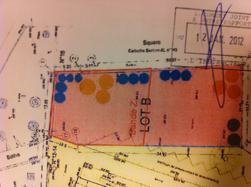 (en photo : PLAN DU LOT OÙ SERA CONSTRUITE LA CRÈCHE. LES RONDS INDIQUENT LES 19 ARBRES À ABATTRE. EN JAUNE, LES 6 TILLEULS.)