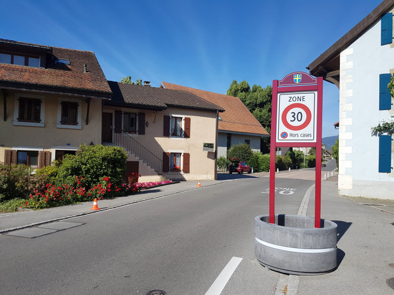 Au printemps 2018, la signalisation « zone 30 » a été mise en place dans le centre du village. Des bornes et panneaux ad hoc ont été posés aux différents points d’entrée de la zone 30 ainsi qu’un marquage au sol. La plupart des passages piétons ont alors été supprimés, sauf aux abords des zones sensibles (école), comme le prévoit la loi.