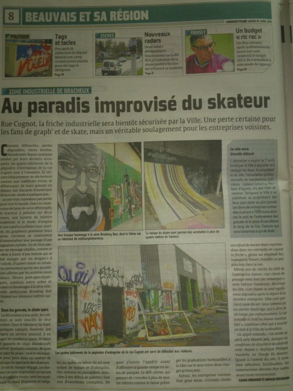 Bonjour, je viens actuellement d'apprendre que notre petit coin de paradis du ride était en péril ! Effectivement, aujourd'hui dans le courrier picard vient d'apparaître un article sur notre spot (Photo jointe ci-dessous). Ce lieu fut laissé à l'abandon par l'ancienne entreprise qui l'exploitait ! Nous l'avons vidés de tous les débris qu'il y avait dedans, nous avons réparés les vélux au plafond, nous l'avons aménagés à notre goût ! Certes, toutes les fenêtres sont broyées et il y a des tags mais ceci à cause des petits délinquants des bacs à sable qui n'ont pas de terrain de jeu ! Alors, c'est encore les skateurs qui prennent des coups de bâtons sur la tête !