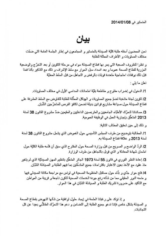 و إذ نؤكد على رغبتنا الملحة في إيجاد حلول توافقية من شأنها النهوض بقطاع الصحة و الصيدلة بشكل خاص فإننا ندعو جميع الطلبة إلى التضامن و دعم هذا التحرّك الطلاّبي بعيدا عن كل التجاذبات