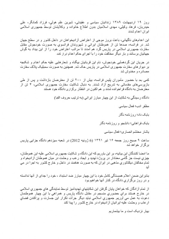 از تمام آزادگان كه خواهان پايان گرفتن اين شكايتهاي تهديدآميز توسط نمايندگي هاي جمهوري اسلامي در خارج هستند براي حضوري منسجم در مقابل دادگاه پاريس و همراهي با اين چهار هموطنمان دعوت به عمل مي آوريم. جمهوري اسلامي نبايد ديگر جرأت تكرار اين جسارت و پراكندن فضاي ارعاب و وحشت عليه ايرانيان آزاديخواه در خارج كشور را پيدا كند