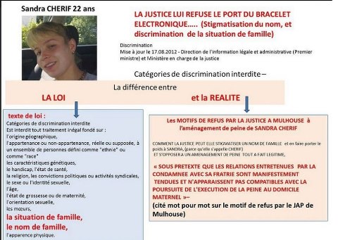 Comment la justice peut-elle stigmatiser un nom de famille ainsi et en faire porter le poids à Sandra, (parce qu'elle s'appelle CHERIF) une jeune fille diplômée, qui travaille, en qualité de mécanicienne chez un grand concessionnaire automobile,et qui se préparait à passer un brevet de maitrise (qui n'est accessible qu'à partir de l'âge de 25ans), et ce dans le but de créer sa propre entreprise dans un autre département - et s'opposer à un aménagement de peine tout à fait légitime, sous prétexte que les relations entretenues par la condamnée avec sa fratrie sont manifestement tendues et n'apparaissent pas compatibles avec la poursuite de l’exécution de la peine au domicile maternel - faudra t-il un drame pour que justice soit faite ???????????
