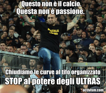 E' ora di dire basta a questo mal costume tutto italiano. Il calcio e lo sport sono due cose diverse; il tifo è una cosa sacrosanta che deve appartenere a uomini, donne e bambini. Gli ultras non rapprensentano nulla di tutto ciò ed è per questo che è arrivato il momento di chiudere le curve al tifo organizzato.