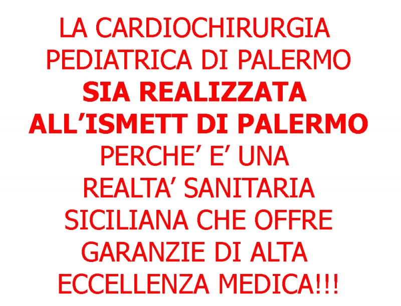 Dopo le complesse vicende succedutesi in questi anni, a partire dal 2010, quando l'allora Assessore Regionale alla Salute, Massimo Russo, decise di chiudere il reparto palermitano di Cardiochirurgia Pediatrica, che era stato diretto dal Prof. Carlo Marcelletti, trasferendo il Centro di Eccellenza presso il Presidio Ospedaliero provinciale “San Vincenzo” di Taormina, quale atto propedeutico alla creazione di un nuovo polo pediatrico nel capoluogo regionale, finalmente la Giunta regionale ha sancito il ripristino del Centro di Cardiochirurgia Pediatrica a Palermo, ma si discute in atto della sua esatta allocazione considerato che l’attuale Assessore alla Salute, Baldo Gucciardi, con decreto ha indicato l’ARNAS/Civico, ma l’Assemblea Regionale Siciliana con Ordine del Giorno n. 364 del 21 settembre 2016 ha dato mandato all’Assessore Regionale per la Salute ad allocare la Cardiochirurgia Pediatrica ed il Centro di assistenza di III° livello Cardiologico Pediatrico e per i pazienti GUCH presso l’IRCCS/ISMETT di Palermo.