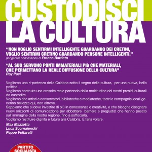 "NON VOGLIO SENTIRMI INTELLIGENTE GUARDANDO DEI CRETINI, VOGLIO SENTIRMI CRETINO GUARDANDO DEGLI INTELLIGENTI". Per gentile concessione di Franco Battiato. "AL SUD SERVONO PONTI IMMATERIALI PIù CHE MATERIALI, CHE PERMETTANO LA REALE DIFFUSIONE DELLA CULTURA". Roy Paci. Vogliamo una ri-partenza della Calabria sotto il segno della cultura, per una nuova bella politica. Vogliamo costruire la crescita reale partendo dalla moltitudine dei nostri presidi culturali da custodire. Vogliamo che artisti e conservatori, biblioteche e mediateche, teatri e compagnie locali generino bellezza qui, non altrove. Sappiamo che si deve investire di più in conoscenza e creatività, e che bisogna disegnare nuovi orizzonti di comunicazione per abbattere barriere e pregiudizi che hanno pesato sull'immagine della nostra regione, fino a soffocarla. Vogliamo restituire dignità e futuro alla Calabria. E farla volare. Max Mazzotta Luca Scornaienchi Peppe Voltarelli Firma anche tu il manifesto "CUSTODISCI LA CULTURA" promosso da Eva Catizone