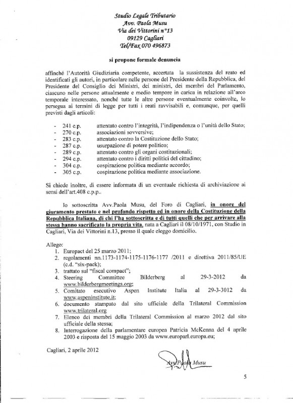 Paola mi ha pregato di veicolare il seguente messaggio a TUTTI i fan di questa pagina: http://www.facebook.com/PaolaMusu “GRAZIE, GRAZIE DI CUORE A TUTTI QUANTI. Ho ponderato molto bene il significato del mio gesto. So che puo’ avere delle conseguenze anche molto gravi. Quindi la vicinanza di tutti mi fa molto bene”. Le ho chiesto di autorizzarmi a pubblicare una sua fotografia e la sua biografia. Mi ha risposto che preferisce che la sua immagine non venga resa pubblica. Posso solo dirvi che dalla voce Paola ha un’apparente eta’ che puo’ andare dai 30 ai 40 anni. Ho chiesto in che modo possiamo supportare la cosa. Mi ha risposto che ci sono vari modi: 1. ogni singolo cittadino puo’ presentare una denuncia simile presso la procura di sua competenza facendo sua e allegando una copia della denuncia di Paola. 2. un gruppo di cittadini puo’ fare una denuncia collettiva con le stesse modalita’ di cui al puntio 1. 3. si puo’ organizazre una petizione on line e una volta raggiunto un obiettivo in termini di numero di firme, chiedere ad un legale di fare una denuncia (come per i punti 1 e 2) allegando l’elenco dei sottoscrittori. Dovremo approfondire. Paola si e’ detta disponibile a darci qualche suggerimento ove ve ne fosse la necessita’.
