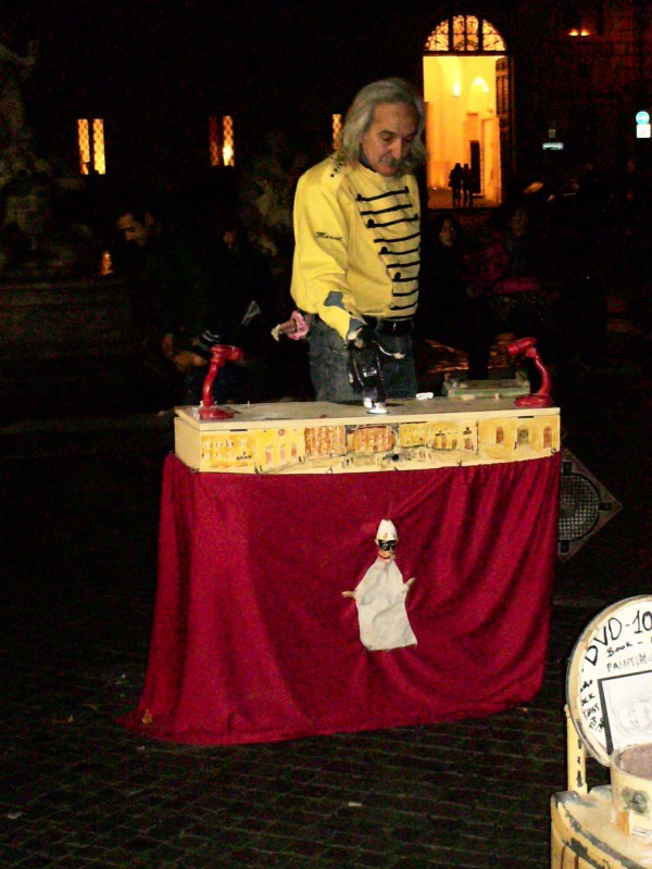 "Marcel, in questi 20 anni ha fatto rivivere "GHETANACCIO", personaggio realmente esistito nel periodo dell'800, che nel preciso punto di Piazza Navona, di fronte alla Fontana del Moro, si esibiva con il suo Teatrino Mobile, dando vita, attraverso i suoi Burattini, a degli spettacolini rimasti nella STORIA"