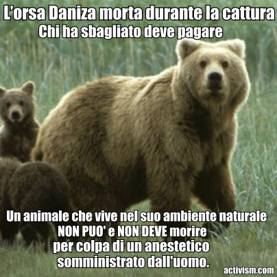 C'è assolutamente bisogno di una legge immediata per regolamentare la cattura di animali che secondo solamente alcune istituzioni sono considerati "potenzialmente pericolosi". Un animale che difende i proprio cuccioli o che comunque non fa nulla di male se non sopravvivere nel suo ambiente naturale, non può e NON DEVE morire per cause prodotte dall'uomo (nel caso dell'orsa Daniza, per colpa di un anestetico).