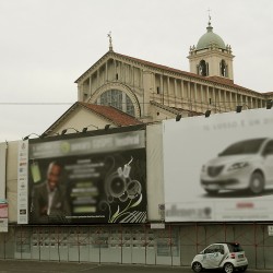 Che da anni il muro della tipografia San Gaudenzio è impacchettato in un ponteggio non giustificato dalla presenza di alcun lavoro di consolidamento dello stesso e utilizzato solo come spazio pubblicitario in affitto a totale vantaggio della concessionaria privata che è proprietaria degli spazi a migliaia di euro al mese.