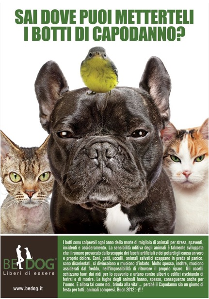 Tutti loro la notte dell'ultimo dell'anno vivono momenti di angoscia assoluta a causa dei botti di fine anno che provocano ogni anno la morte di almeno 1000 cani, altrettanti gatti e svariate miglaia di animali da compagnia in particolare piccoli uccelli e animali da allevamento. In particolare ogni anno a causa dei botti almeno 500 cani ed altrettanti gatti in età avanzata muoiono d'infarto solamnente in Italia. A questi aggiungiamo i milioni di umani anziani e cardiopatici che vivono con angoscia le ore di passaggio da un'anno all'altro. Quest'anno vogliamo protestare (invieremo le firme al capo del governo ed a tutti i gruppi parlamentari) per chiedere che una volta per tutte i botti di capodanno siano messi fuori legge in quanto oltre a provocare i noti incidenti provocano la morte di migliaia di animali e angoscia in altrettanti migliaia di animali e umani.