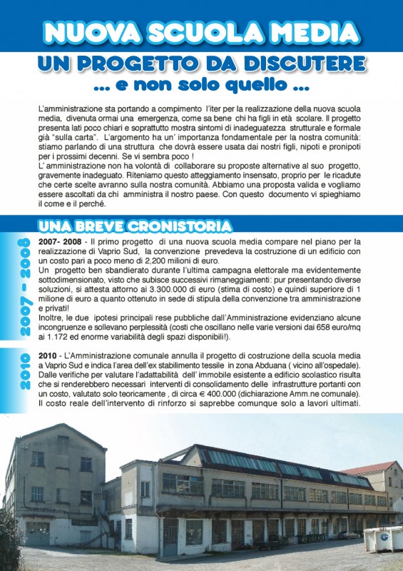 La scuola realizzata in questa struttura, non consentirebbe una flessibilità planimetrica, ideale per poter dotare e suddividere la scuola dei necessari spazi per la didattica, laboratori e spazi accessori, così come dovrebbe essere per una scuola rivolta verso il futuro e di cui il nuovo edificio scolastico risulterebbe già carente. Segnaliamo l'esempio di una situazione simile alla nostra, il Liceo Legnani di Saronno, costruito completamente nuovo, con 35 aule e 600 mq. di laboratori, con un costo simile a quello della nuova scuola media di Vaprio. Pensiamo che la stima dei costi per realizzare la scuola a Vaprio non sia attendibile, inoltre il preventivo è stato presentato senza considerare gli impianti. Nel progetto presentato, l'ingresso della scuola lo riteniamo inadeguato, sarebbe più ampio e sicuro situarlo in piazza Trieste. La convivenza di magazzini comunali e sedi di associazioni è inaccettabile per una scuola di qualità. Evidenziamo il disagio di un cantiere aperto durante l'attività scolastica. Non è stato chiarito se la palestra ci sarà oppure no all'avvio della nuova scuola, visto che è stata inserita in un bando a parte…. Noi firmatari, siamo convinti che soltanto un confronto reale ed approfondito su come dovrà essere realizzata la nuova scuola media, con proposte alternative, anche radicalmente diverse dal progetto attuale, possa portare ad una scelta più consona all'importanza dell'opera da realizzare. Riteniamo che anche il lato economico possa essere affrontato confrontando varie soluzioni e proposte. Per questi motivi, CHIEDIAMO all'amministrazione di rivedere il progetto e di rendersi disponibile ad un confronto con tutti i soggetti interessati.
