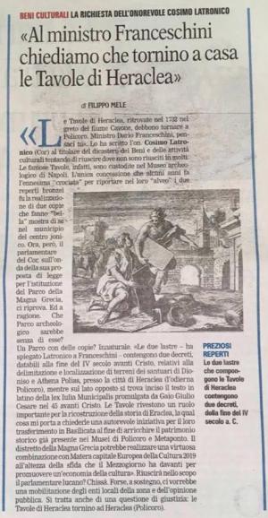 Sosteniamo tutti la richiesta dell’Onorevole Cosimo Latronico, inoltrata al Ministro dei Beni e delle attività Culturali e del Turismo Dario Franceschini, per poter riportare a Policoro le famose Tavole bronzee di Heraclea.