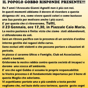 Il prossimo 23 Gennaio, alle ore 17.30, il popolo GOBBO si ritrovera’ in Piazzale Caio Mario per ricordare l’Avvocato Gianni Agnelli nel 7° anniversario della Sua scomparsa, gridare piena fiducia a Roberto Bettega e ribadire che senza gli Uomini che hanno scritto la storia, non si va lontano.