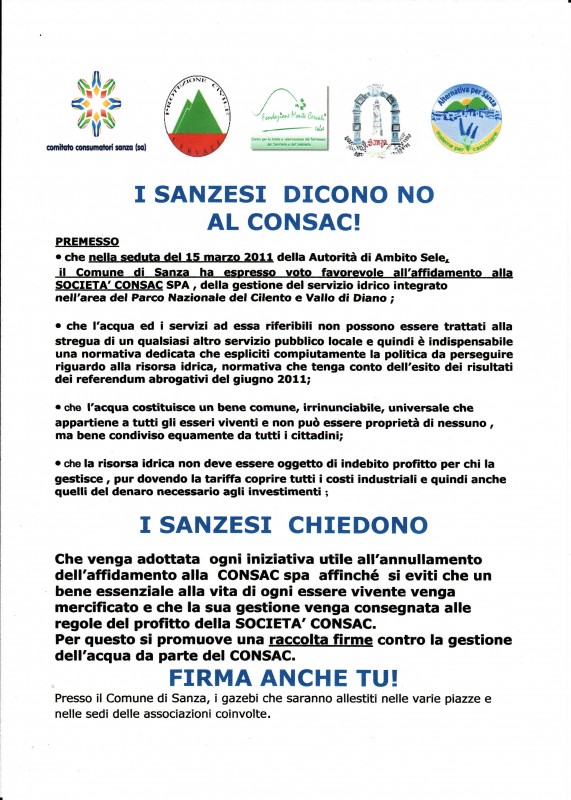 PETIZIONE POPOLARE CONTRO IL PASSAGGIO DEL SERVIZIO IDRICO DEL COMUNE DI SANZA AL CONSAC SPA
