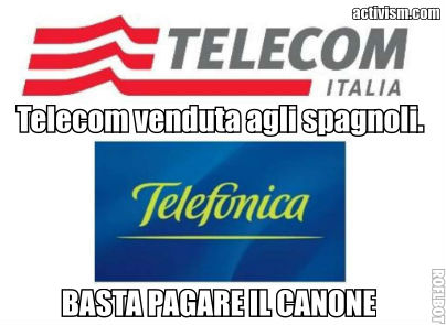 L'Italia è in svendita, Telecom è stata venduta al colosso spagnolo delle telecomunicazioni Telefonica. Se il canone Telecom andava allo Stato per finanziare la banda larga, ora che Telecom non è più una società italiana questo canone non deve essere più pagato. Non dobbiamo arricchire gli azionisti spagnoli.