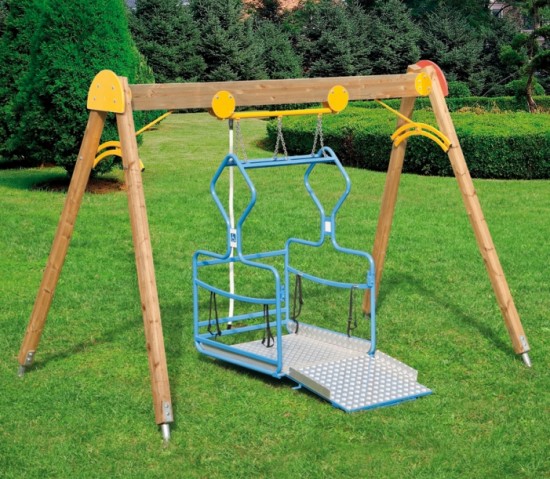 Basta davvero poco. Infatti, esistono delle altalene appositamente formulate per poter essere usate da chi non può deambulare se non coadiuvato da un mezzo adatto. Più basse, larghe e robuste, adatte a ospitare al loro interno la carrozzina e il suo piccolo ospite.