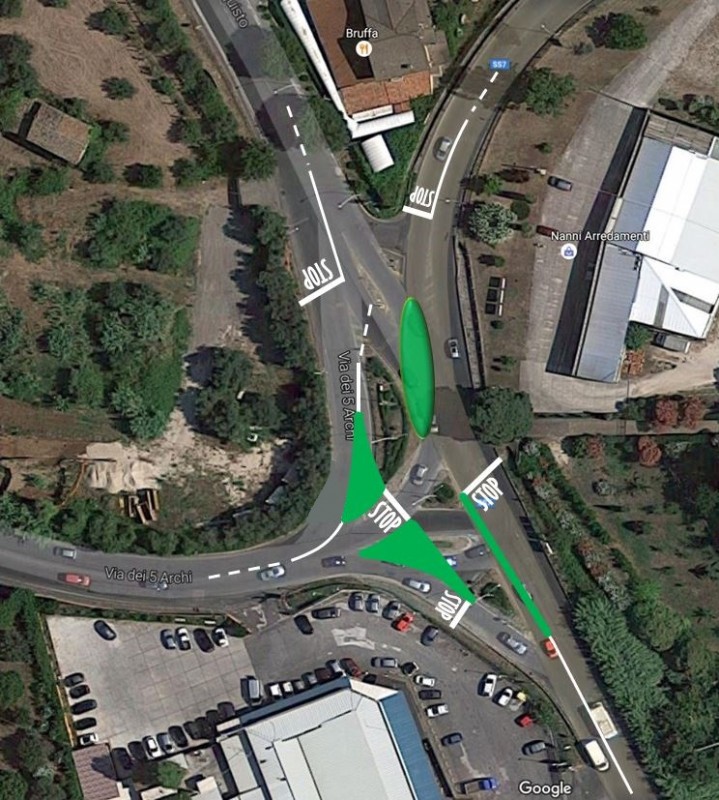 Alle autorità competenti in materia, si propone modifica della viabilità dell'incrocio in oggetto, e comunque si richiede a chi di dovere di rivedere e modificare l'attuale sistemazione in quanto confusionaria e pericolosa.