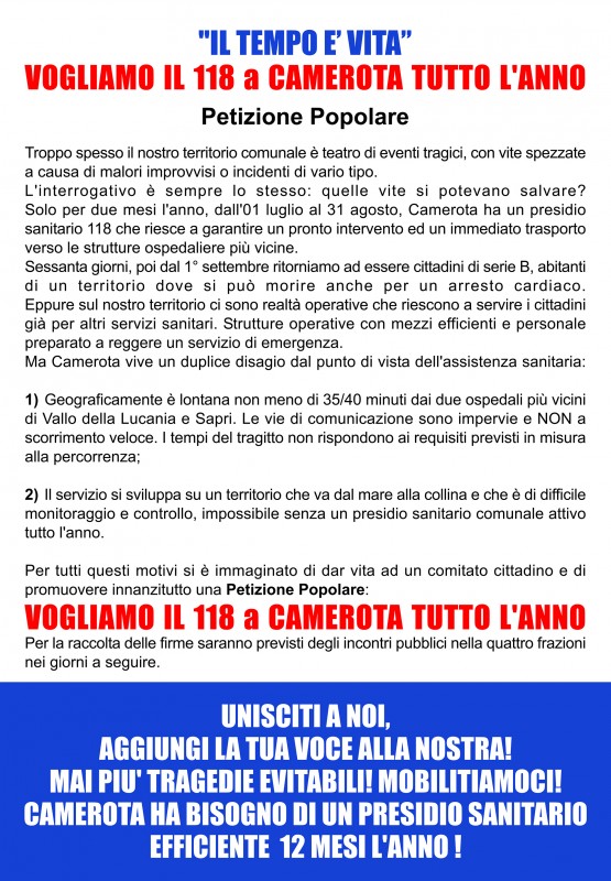 “VOGLIAMO IL 118 a CAMEROTA TUTTO L'ANNO”