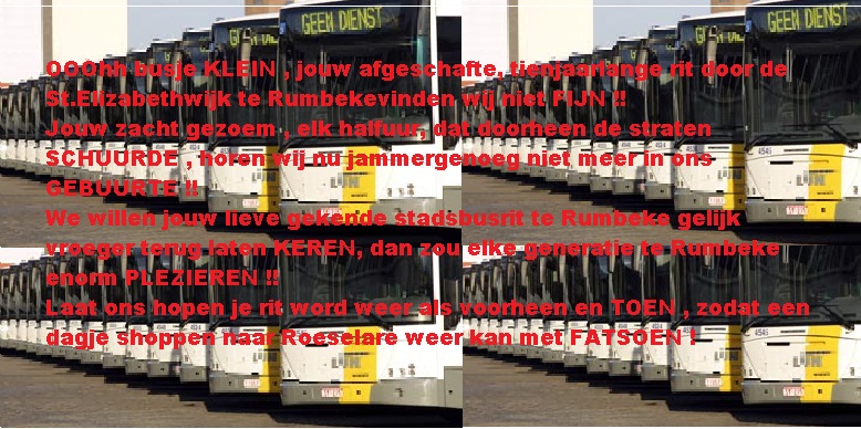 De stadsbus te Rumbeke , namelijk beter gekend al van in het prille begin (JUNI 2001), als de groene lijn nummer 6 tussen OEKENE EN ROESELARE, is drastisch gewijzigd ! Reeds tienjaar lang bleef deze druk gebruikte route ongewijzigd en nu plots sedert JULI 2012 zijn er vier opéénvolgende haltes te RUMBEKE afgeschaft !