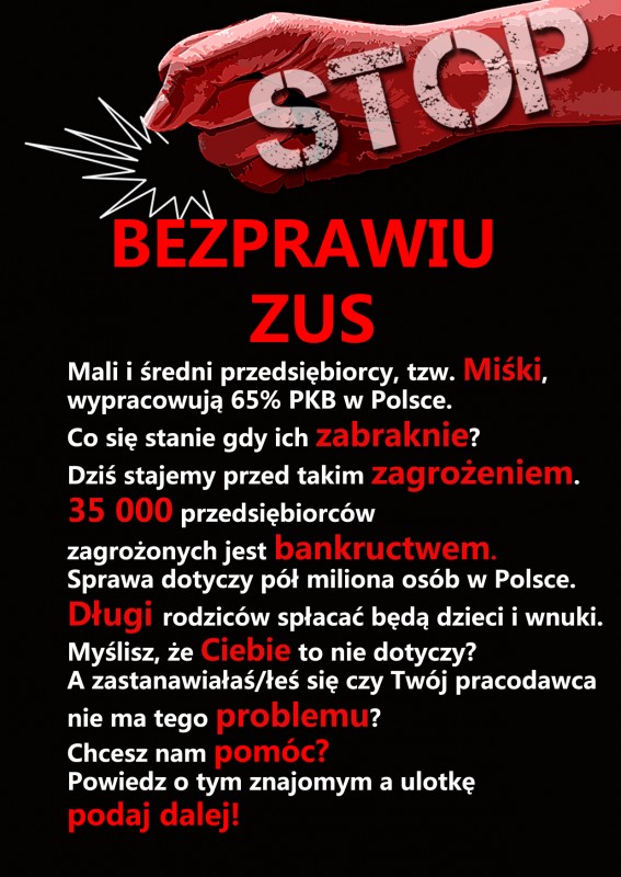 Jako, że prawo nie działa wstecz, a przynajmniej nie powinno w państwie prawa, domagamy się podjęcia kroków zmierzających do ukrócenia praktyki podejmowanej przez ZUS i przywrócenia porządku w ustawach. Dlatego wyrażamy wsparcie dla działań przedsiębiorców, zmierzających do poprawy i wprowadzenia ustawy umorzeniowej, która obejmowałaby pokrzywdzonych przez interpretację prawa podejmowaną przez ZUS i pozwoliła im wrócić do normalnego życia. To przedsiębiorcy są solą tej ziemi a ich nękanie i utrudnianie działalności ma niszczący wpływ na polską gospodarkę.