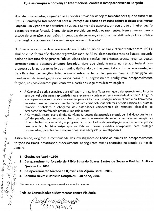 Nós, abaixo-assinados, exigimos que as devidas providências sejam tomadas para que se cumpra no Brasil a Convenção Internacional para a Proteção de Todas as Pessoas contra o Desaparecimento Forçado. Em vigor desde dezembro de 2010, a Convenção assevera, em seu artigo primeiro, que “o desaparecimento forçado é uma violação proibida em todos os momentos. Nem a guerra, nem o estado de emergência ou razões imperativas de segurança nacional, instabilidade política pública ou emergência podem justificar um desaparecimento forçado”.
